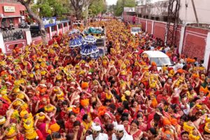 भीलवाड़ा। धर्मनगरी भीलवाड़ा में पहली बार आयोजित हो रही श्री शिव महापुराण कथा को लेकर शहर में भक्ति का माहौल चरम पर है। कथा से पूर्व निकाली गई भव्य कलश शोभायात्रा में मातृशक्ति का अभूतपूर्व सैलाब उमड़ पड़ा। शहर के प्रमुख मार्गों पर जहां तक नजर गई, वहां चुंदड़ी ओढ़े महिलाओं की कतारें ही दिखाई…