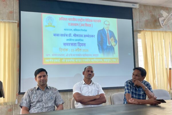 शाहपुरा (भीलवाड़ा)-राजेन्द्र खटीक। श्री प्रताप सिंह बारहट राजकीय महाविद्यालय, शाहपुरा अखिल भारतीय राष्ट्रीय शैक्षिक महासंघ (ABRSM) की स्थानीय इकाई के तत्वावधान में आधुनिक भारत के निर्माता और भारतीय संविधान के शिल्पकार डॉ. भीमराव अंबेडकर की जयंती को “समरसता दिवस” के रूप में हर्षोल्लास के साथ मनाया गया। कार्यक्रम का शुभारंभ मां सरस्वत्ती और डॉ. भीमराव…