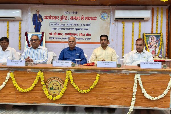 शाहपुरा (भीलवाड़ा)-राजेन्द्र खटीक। महर्षि दयानंद सरस्वती विश्वविद्यालय (MDSU) स्थित अम्बेडकर शोधपीठ के तत्वावधान में ‘अम्बेडकर दृष्टि: समता से सामर्थ्य’ विषय पर एक दिवसीय राष्ट्रीय संगोष्ठी का आयोजन किया गया। कार्यक्रम में विशिष्ट अतिथि के रूप में शाहपुरा विधायक व प्रबंध मंडल सदस्य डॉ. लालाराम बैरवा शामिल हुए।संगोष्ठी को संबोधित करते हुए डॉ. बैरवा ने कहा…